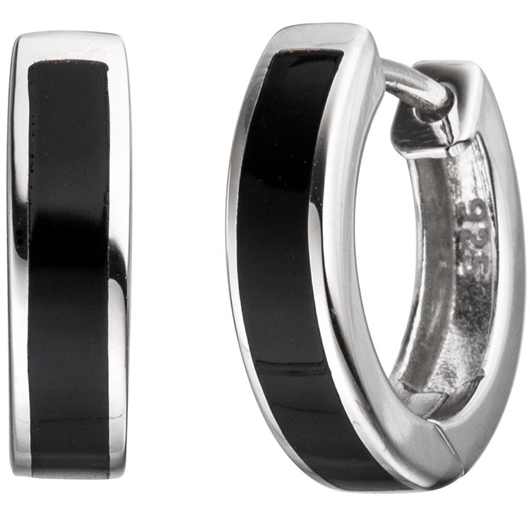1 Paar Creolen mit Klappmechanik aus 925 Sterlingsilber, rhodiniert, mit Onyx-Imitation