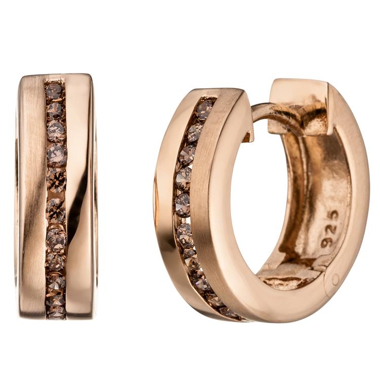 1 Paar Creolen - Ohrringe mit einem Außendurchmesser vom ca. 15,5 mm und einer Klappmechanik aus 925 Sterlingsilber, rotvergoldet und teilmattiert, mit braunen Zirkonia.