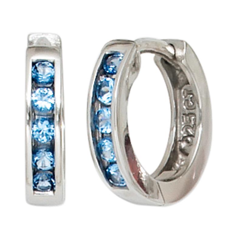 1 Paar Creolen mit Klappmechanik aus 925 Sterlingsilber, rhodiniert, mit 10 hellblauen Zirkonia