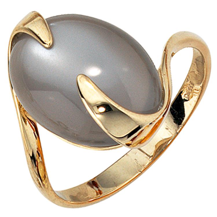 Ein ca. 17,4 mm breiter Damenring aus 14 Karat (585) Gelbgold mit einem Mondstein-Cabochon.