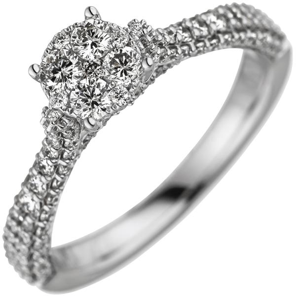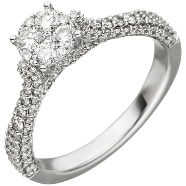 Ein ca. 6,3 mm breiter Damen Ring aus 14 Karat (585) Weißgold mit 119 Diamanten-Brillanten, 1,02 ct., W/SI wesselton (weiß), SI=(kleine, mit bloßem Auge nicht erkennbare natürliche Einschlüsse), Feinbearbeitung gut.