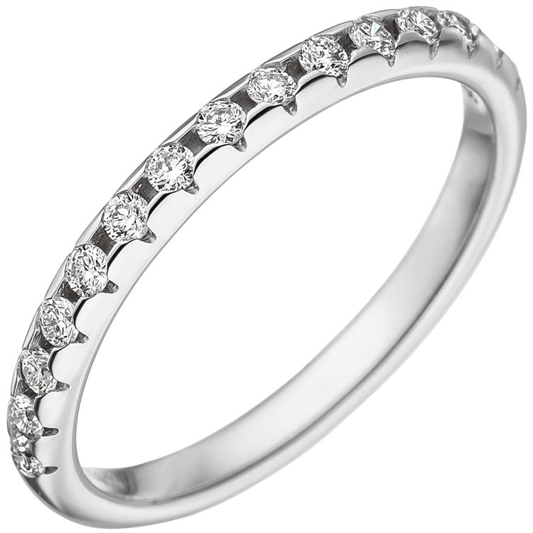 Ein ca. 2,4 mm schmaler Damenring aus 14 Karat (585) Weißgold mit 15 Diamantenen-Brillanten, 0,29 ct., W/SI wesselton (weiß), SI=(kleine, mit bloßem Auge nicht erkennbare natürliche Einschlüsse), Feinbearbeitung gut.