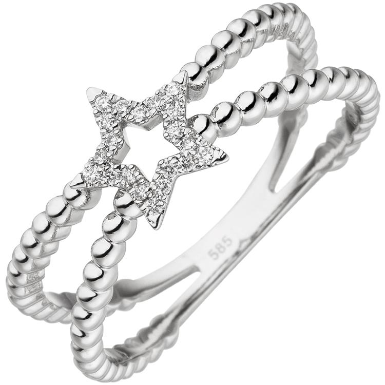 Ein ca. 7,8 mm breiter Damenring "Stern" aus 14 Karat (585) Weißgold mit 20 Diamanten-Brillanten, 0,07 ct., W/SI wesselton (weiß), SI=(kleine, mit bloßem Auge nicht erkennbare natürliche Einschlüsse), Feinbearbeitung gut