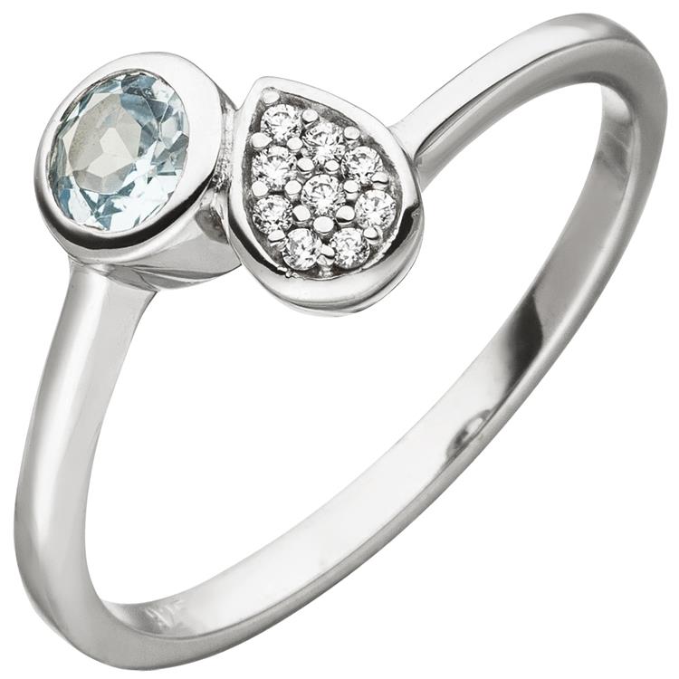 Ein ca. 9,3 mm breiter Damenring aus 925 Sterlingsilber, rhodiniert, mit einem behandelten Blautopas und 9 Zirkonia.