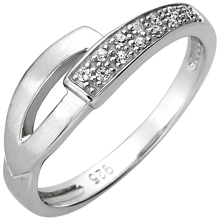 Ein ca. 5,8 mm breiter Damenring aus 925 Sterling Silber, rhodiniert und teilmattiert, mit 13 Zirkonia.