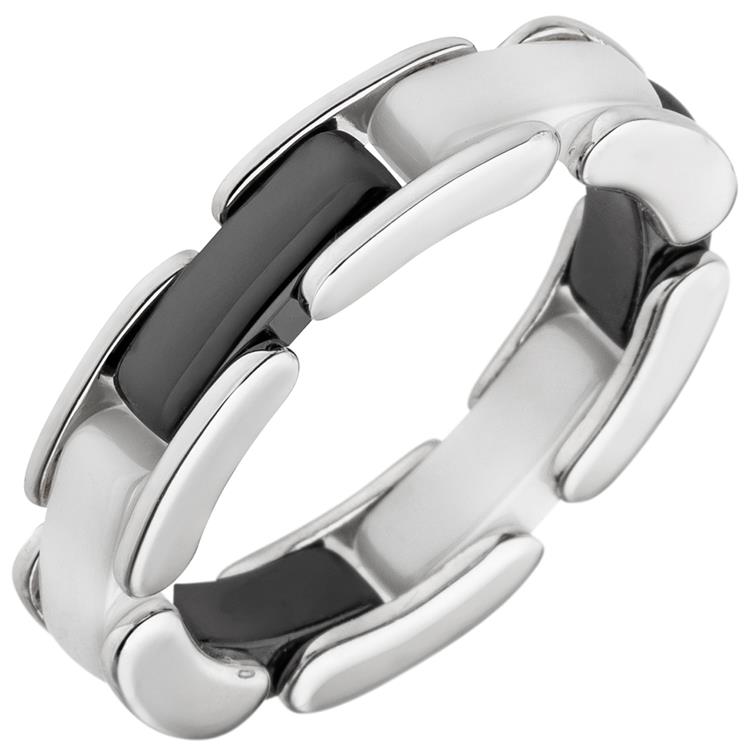 Ein ca. 5,1 mm breiter Damenring aus 925 Sterlingsilber, rhodiniert, mit schwarzer und weißer Keramik kombiniert.