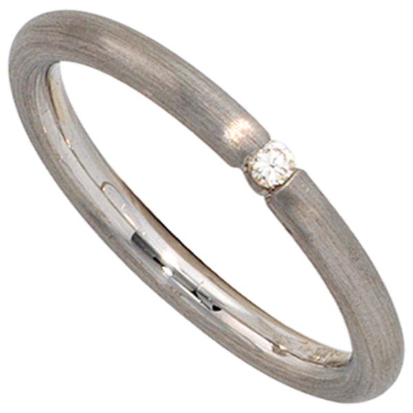 Damen Ring aus 925 Sterling Silber, rhodiniert und mattiert, mit einem Diamanten-Brillanten, 0,03 ct., W/P1 wesselton (weiß), 1. Piqué (mit bloßem Auge schwer erkennbare natürliche Einschlüsse), Feinbearbeitung gut.