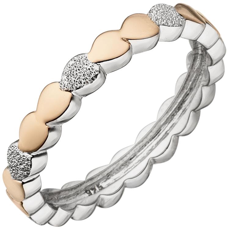 Ein ca. 3,3 mm breiter Damenring mit Herzen aus 925 Sterlingsilber, rhodiniert und teilrotvergoldet, mit Glitzereffekt.