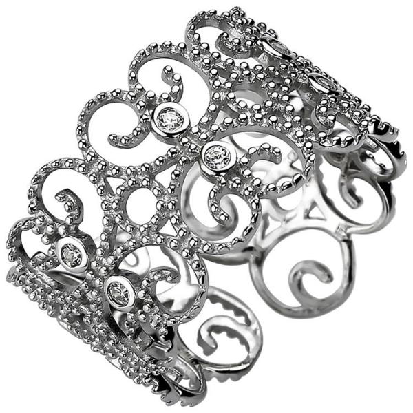 Ein ca. 11,6 mm breiter, offener Damen Ring aus 925 Sterling Silber, rhodiniert, mit 10 Zirkonia.