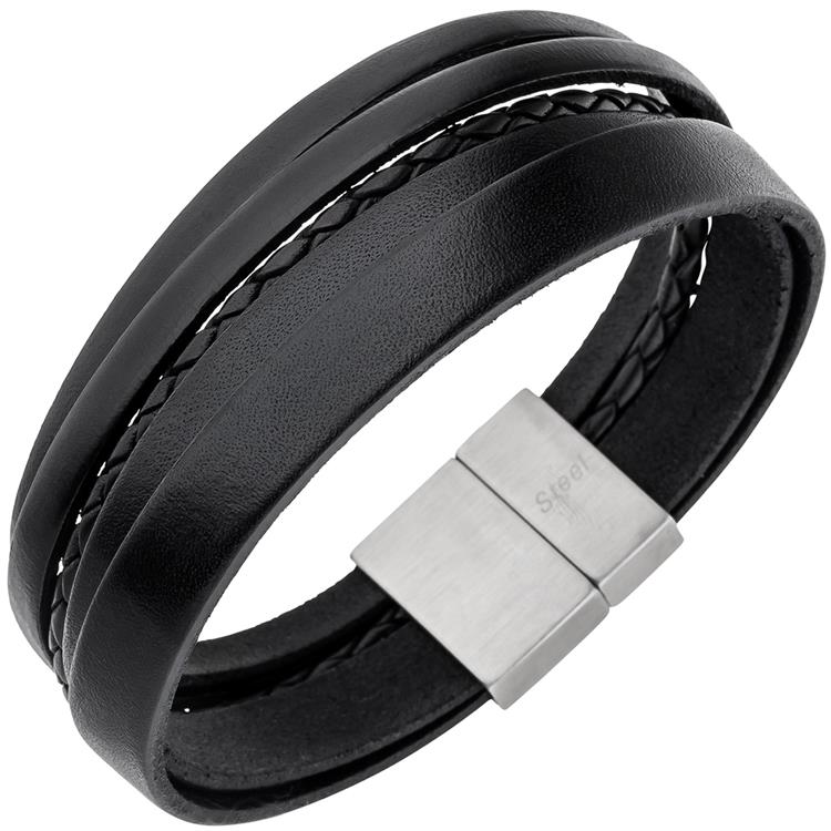 5-reihiges Armband aus schwarzem Leder, zum Teil geflochten, mit Magnetverschluss aus mattem Edelstahl.
