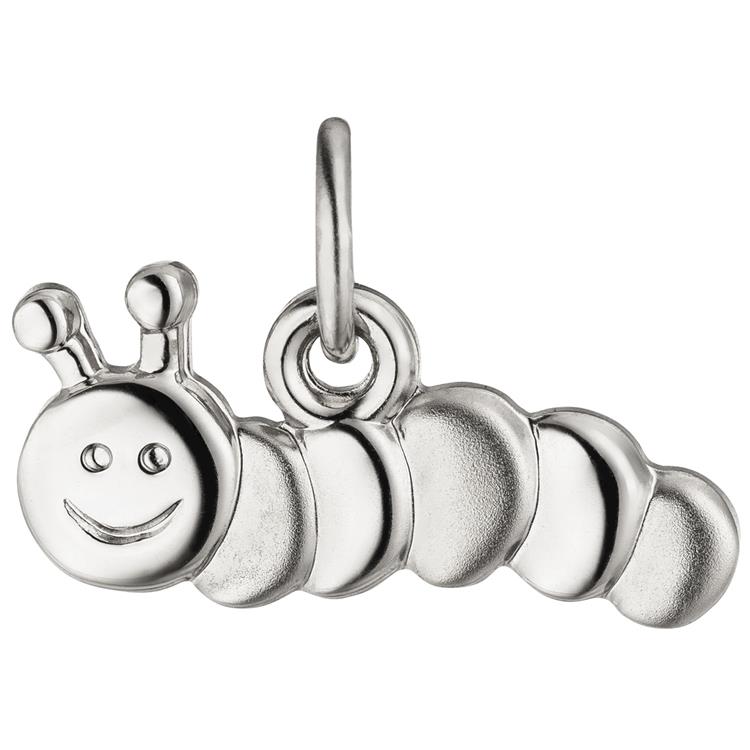 Ein Kinder Anhänger in der Form einer Raupe aus 925 Sterlingsilber, rhodiniert und teilmattiert.