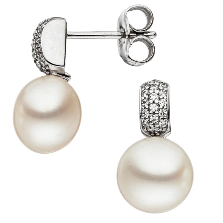 1 Paar Ohrstecker aus 8 Karat (333) Weißgold, mit 2 Süßwasser-Zuchtperlen und 32 Zirkonia