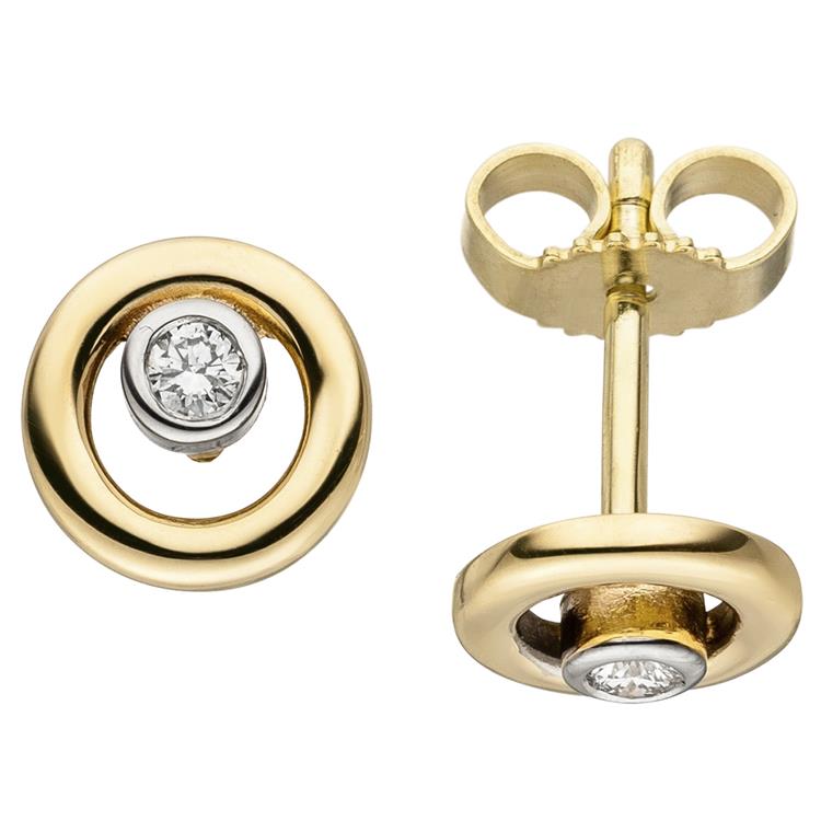 1 Paar Ohrstecker aus 14 Karat (585) Gelbgold, teilrhodiniert, mit 2 Diamant-Brillanten 0,06 ct., W/SI wesselton (weiß), SI=(kleine, mit bloßem Auge nicht erkennbare natürliche Einschlüsse), Feinbearbeitung gut