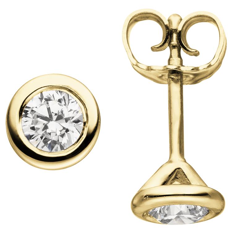 1 Paar runde Ohrstecker mit erinem Durchmesser von ca. 6 mm aus 14 Karat (585) Gelbgold mit 2 Diamanten-Brillanten, 0,50 ct., W/SI wesselton (weiß), SI=(kleine, mit bloßem Auge nicht erkennbare natürliche Einschlüsse), Feinbearbeitung gut.