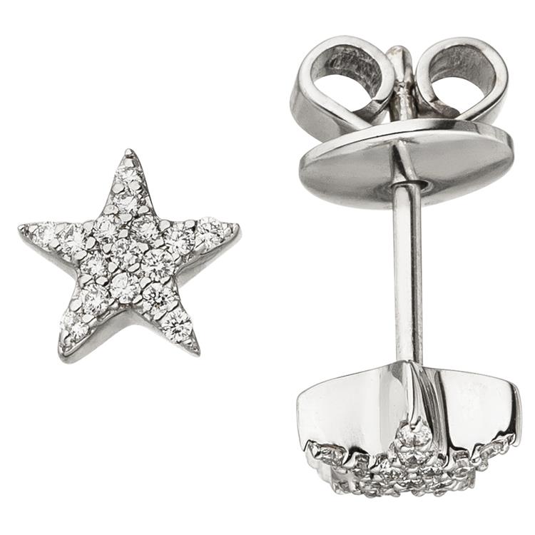 1 Paar Ohrstecker "Stern" aus 14 Karat (585) Weißgold mit 32 Diamant-Brillanten, 0,08 ct., W/SI wesselton (weiß), SI=(kleine, mit bloßem Auge nicht erkennbare natürliche Einschlüsse), Feinbearbeitung gut